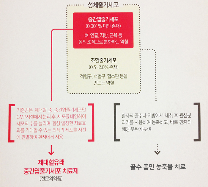 기증받은 제대혈 중 중간엽줄기세포만 GMP시설에서 분리 후, 세포를 배양하여 세포의수를 늘리며, 항상 일정한 치료효과를 기대할 수 있는 최적의 세포를 사전에 판별하여 환자에게 사용